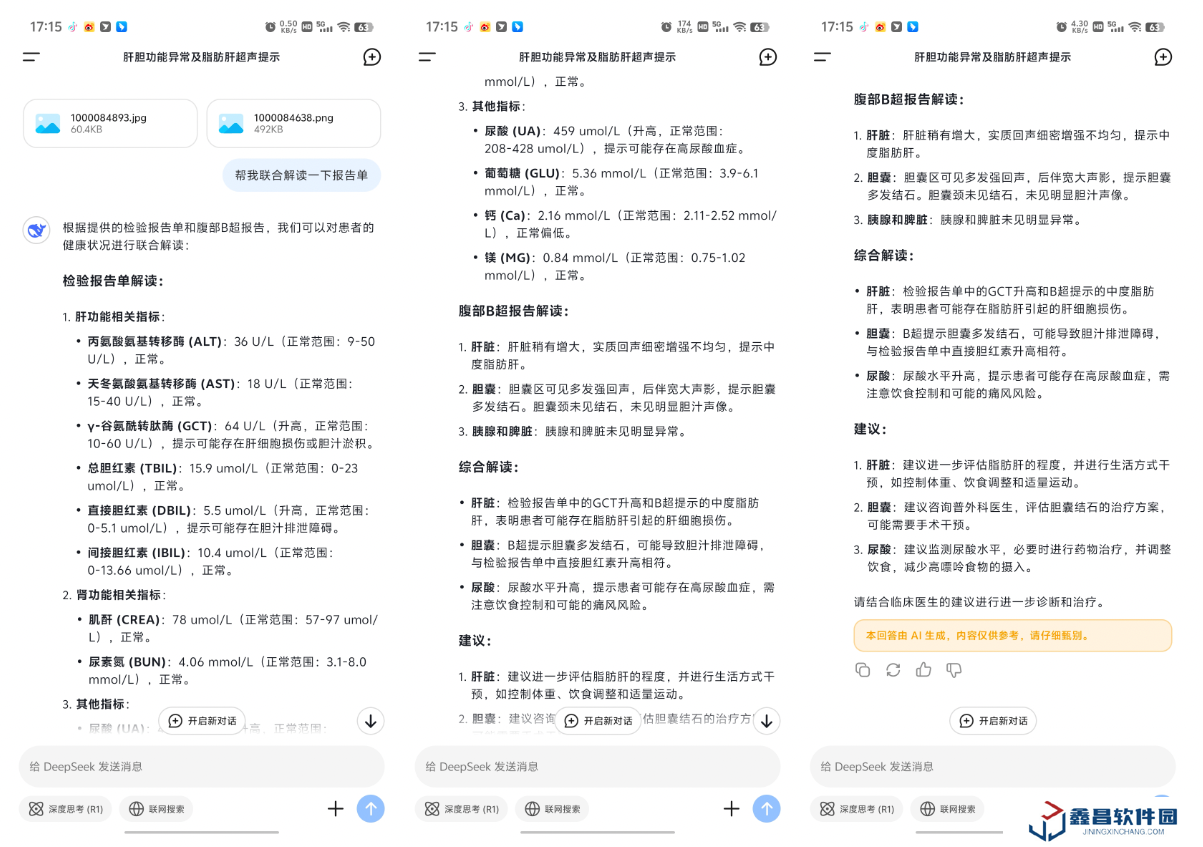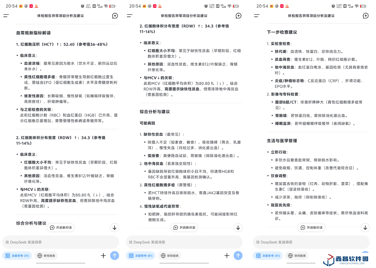 接著,小編也用 DeepSeek 做了測(cè)試,同樣的問(wèn)題給 DeepSeek,可以看到 DeepSeek 將正常項(xiàng)目和異常項(xiàng)目混在一起,看起來(lái)不夠清晰直觀,也不能結(jié)合本人的病史檔案進(jìn)行分析,整體來(lái)說(shuō)屬于比較機(jī)械的解讀,雖然沒(méi)有錯(cuò)誤,但實(shí)用性稍低一些。