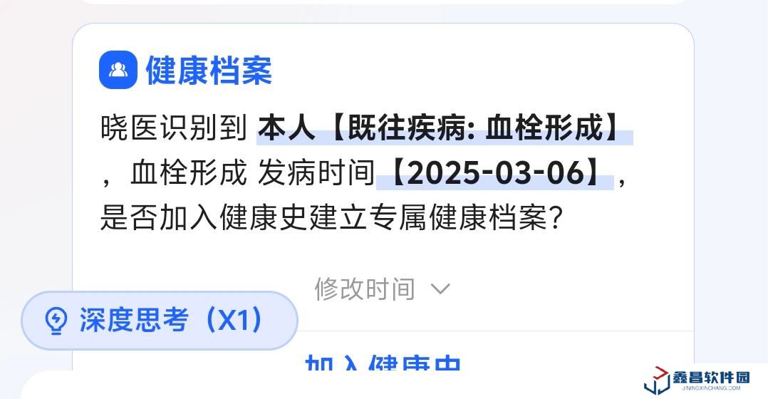 另外值得一提的是,通過(guò)這個(gè)問(wèn)題,訊飛曉醫(yī)識(shí)別到我可能患有血栓,還主動(dòng)建議我添加到既往病史中以完善健康檔案,這一點(diǎn)很細(xì)節(jié)。