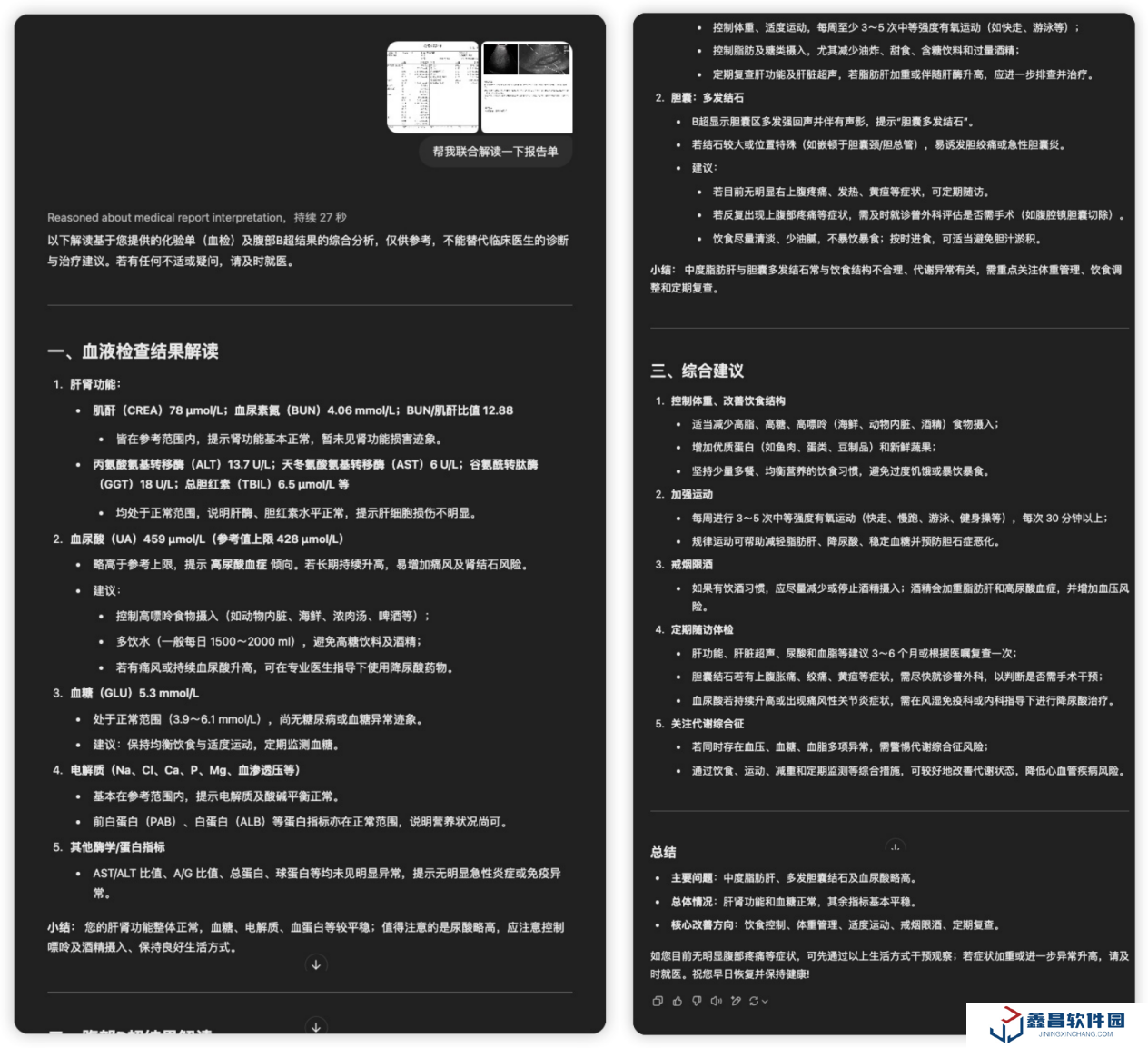 整體來(lái)說(shuō)可以看到,在多模態(tài)解讀報(bào)告單、醫(yī)學(xué)影像方面,訊飛曉醫(yī)的表現(xiàn)依然是非常專業(yè)且實(shí)用的,并且給出的建議也能夠根據(jù)用戶自己的健康檔案做到個(gè)性化、有針對(duì)性。DeepSeek 在這方面有著相似的專業(yè)性和實(shí)用性,但在部分場(chǎng)景下的回答還是略微不夠清晰明了,并且也不能根據(jù)用戶以往病史進(jìn)行個(gè)性化分析。但總體來(lái)說(shuō),訊飛曉醫(yī)和 DeepSeek 的表現(xiàn)都是明顯優(yōu)于 GPT-o1 的。
