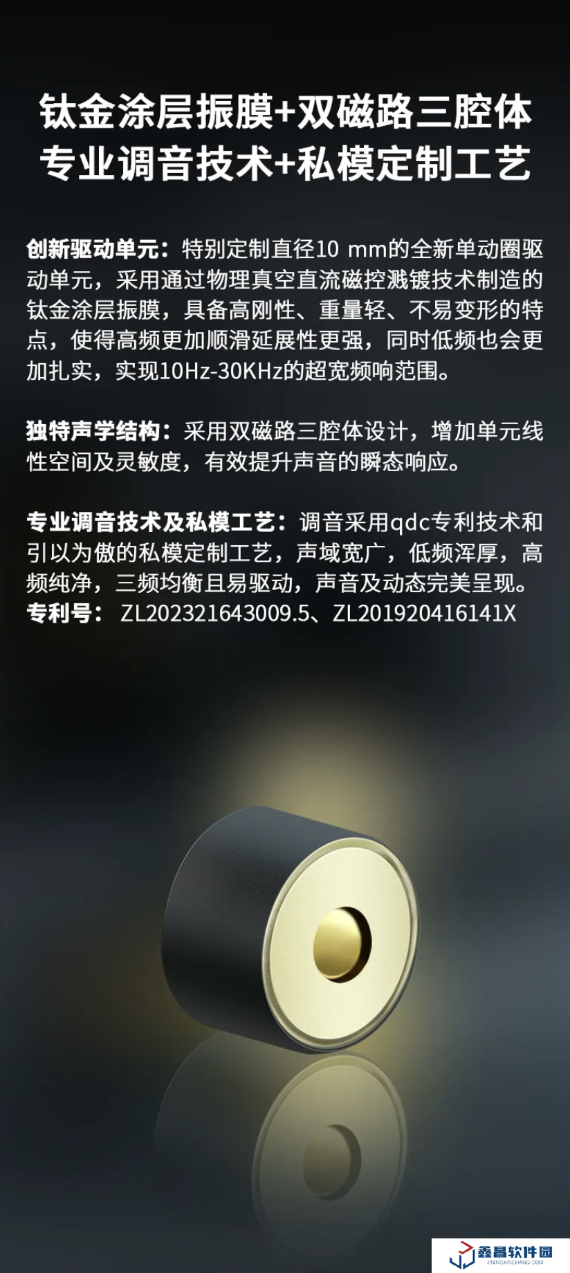 官方稱,相應耳機配備定制的10mm單動圈驅動單元,內置鈦金涂層振膜,可實現10Hz-30KHz頻響范圍。同時耳機采用雙磁路三腔體設計,可以增加單元線性空間,提升聲音的瞬態響應。
