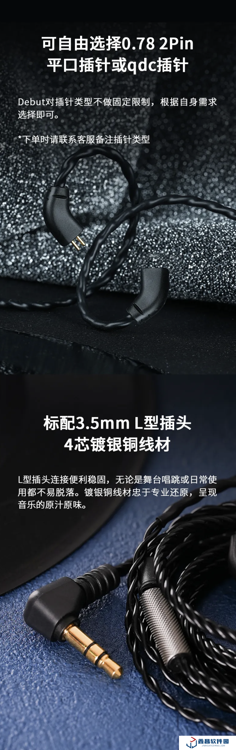 該耳機標配3.5mm L 型插頭,內置4芯鍍銀銅線材,本站附產品參數信息如下: