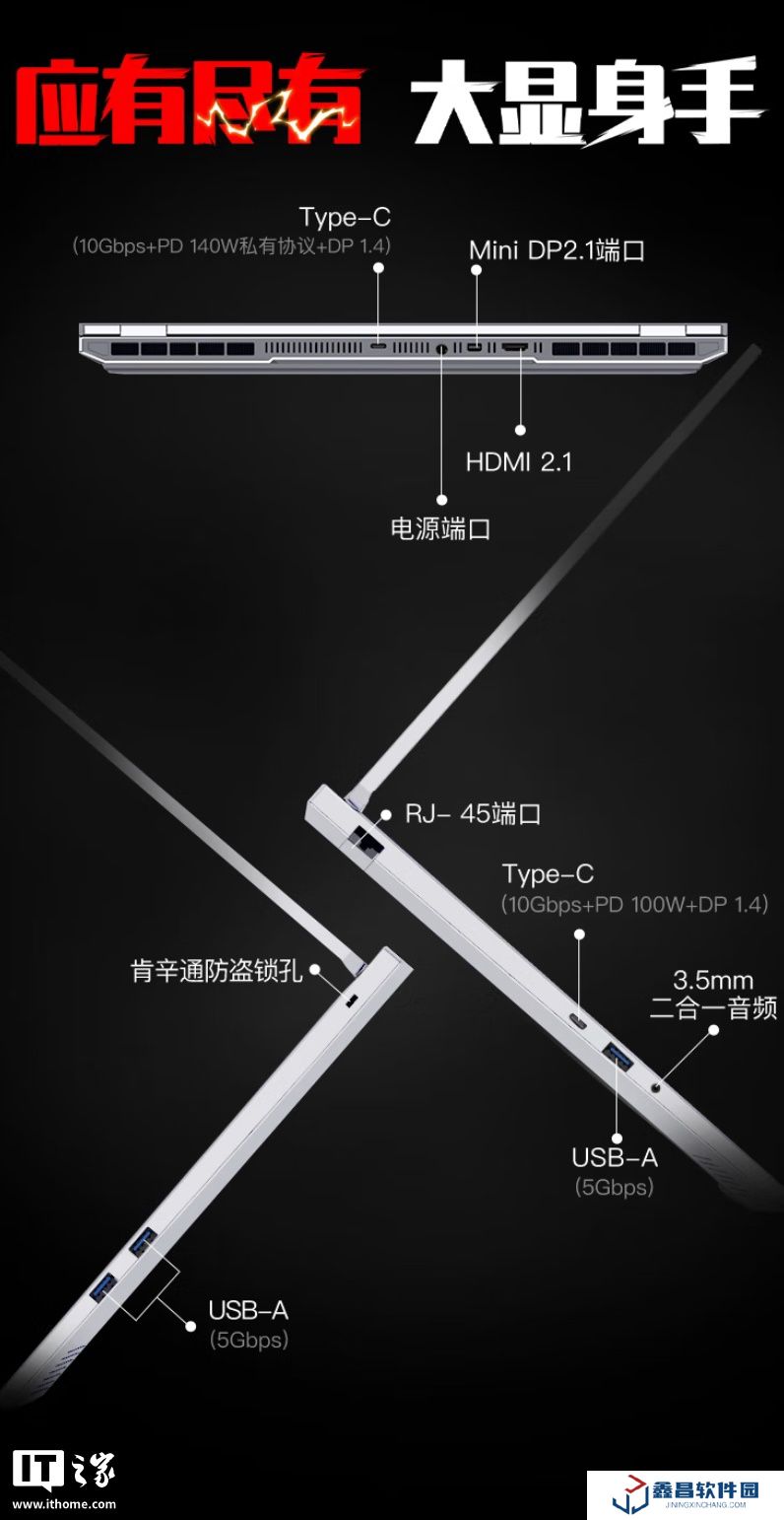 I/O方面,該機左側配備1個 RJ45網口、1個 USB-C 10Gbps接口、1個 USB-A 5Gbps接口、1個 3.5mm音頻接口;右側配備2個 USB-A 5Gbps接口;背面配備1 個 USB-C 10Gbps接口、1個 Mini DP 2.1接口、1個 HDMI 2.1接口。