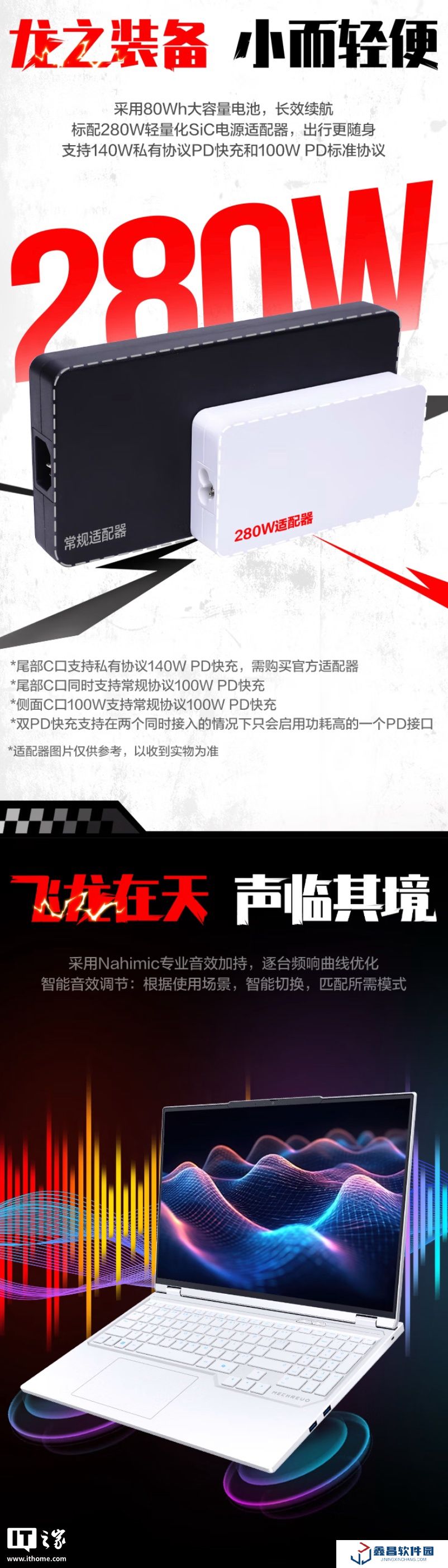 這款筆記本 A 面采用航空級鋁合金材質,帶有機械革命Logo,筆記本擁有Nahimic音效優化,內置80Wh電池(支持140W私有協議 PD 快充和100W PD標準協議),提供280W SiC電源適配器。