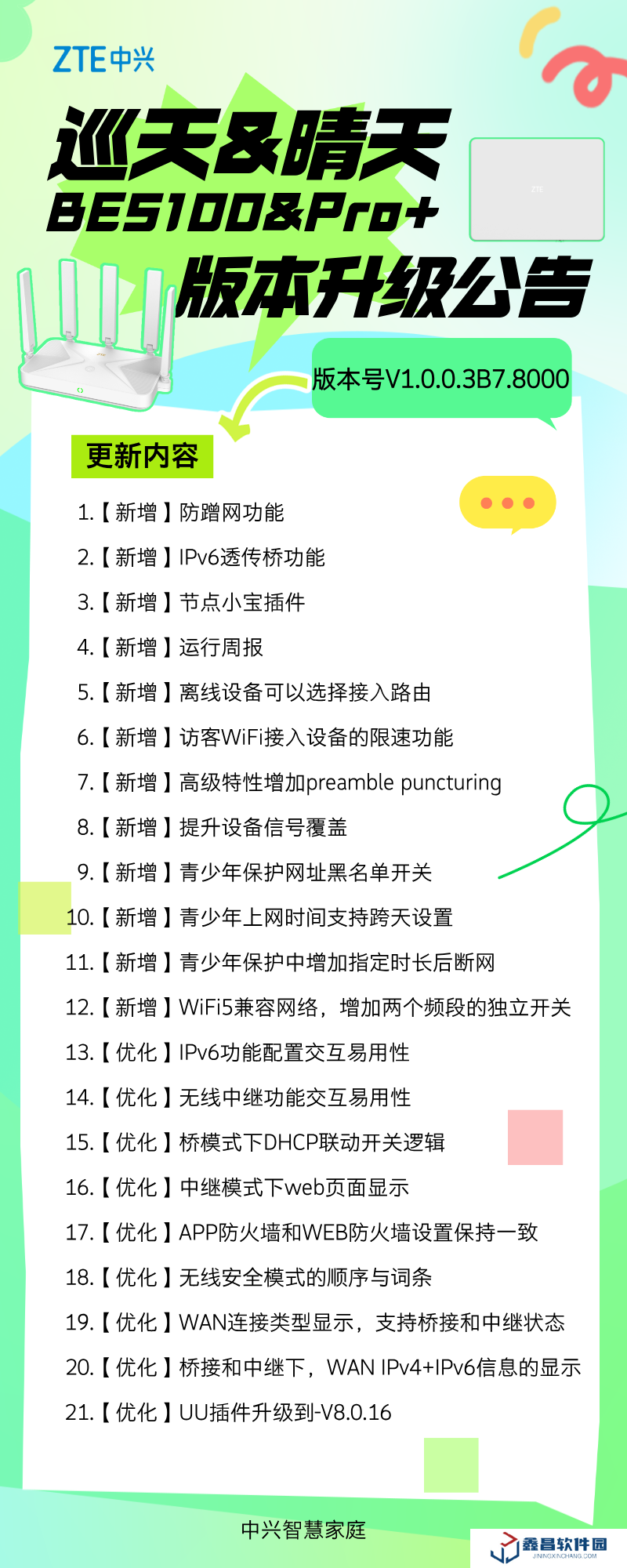 本站 5 月 9 日消息,中興推送巡天 & 晴天 BE5100 / BE5100Pro + 路由器版本升級,版本號 V1.0.0.3B7.8000。