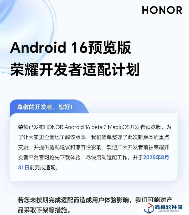 需要注意的是,榮耀互聯網服務還提到,若未按期完成適配而造成用戶體驗影響,可能對產品采取下架等措施。