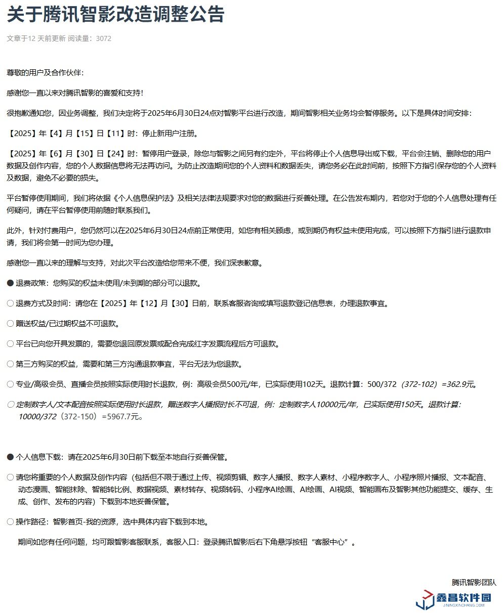 騰訊智影宣布 6 月 30 日起改造,期間相關業務暫停服務