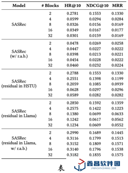 為了進一步分析賦予模型擴展定律的因素,團隊比較了 SASRec 與擴展性良好的 HSTU 和 Llama 的區別,發現主要差異在于 RAB 和注意力模塊內的殘差連接方式。