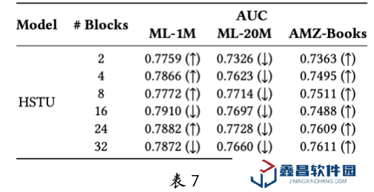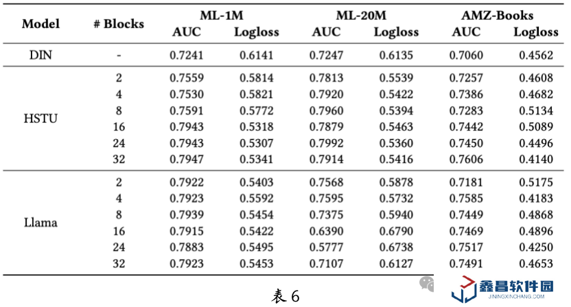 排序是推薦系統中重要的一環,團隊深入探討了生成式推薦模型在排序任務中的有效性和擴展性。正如表 6 所示,生成式推薦大模型在性能上顯著優于 DIN 等傳統推薦模型。盡管在小規模模型下,Llama 的表現優于 HSTU,但 HSTU 在擴展性方面更具優勢,而 Llama 在擴展性上顯得不足。