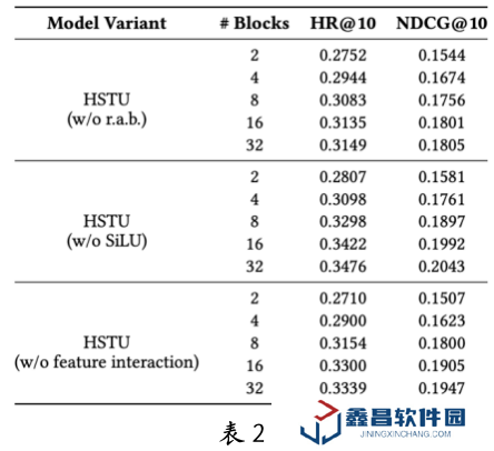為了探究 HSTU 等生成式推薦模型的可擴展性來源,團隊進行了消融實驗,分別去除了 HSTU 中的關鍵組件:相對注意力偏移(RAB)、SiLU 激活函數,以及特征交叉機制。