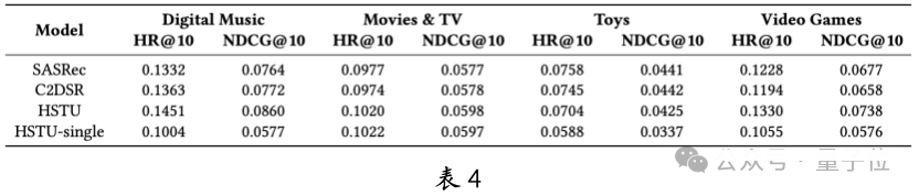 HSTU 在多域、多行為和輔助信息等復雜場景中表現出色。以多域為例,HSTU 在 AMZ-MD 的四個域中始終優于基線模型 SASRec 和 C2DSR(見表 4)。