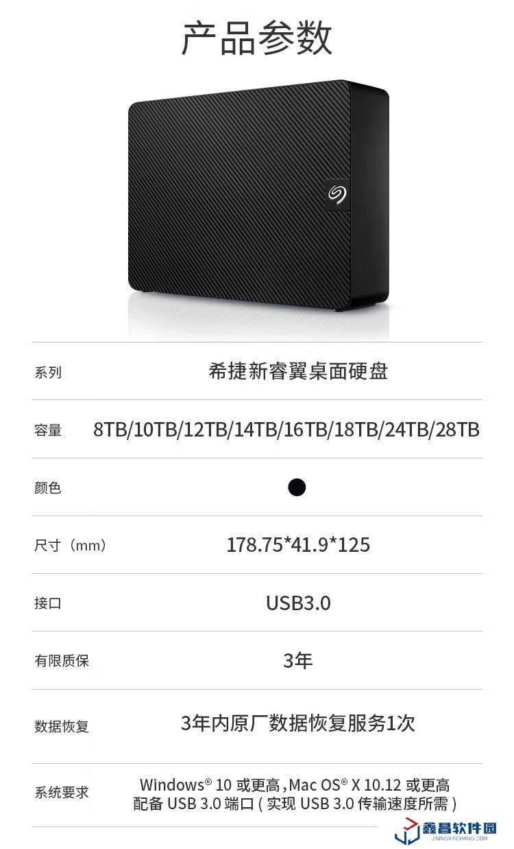 這款產品標配 USB 3.0 并向下兼容 USB2.0,兼容 Windows 和 MacOS 蘋果雙系統,適用多種辦公場景。此外,希捷還為用戶提供了 3 年有限質保及 3 年原廠數據恢復服務。本站附參數詳情如下: