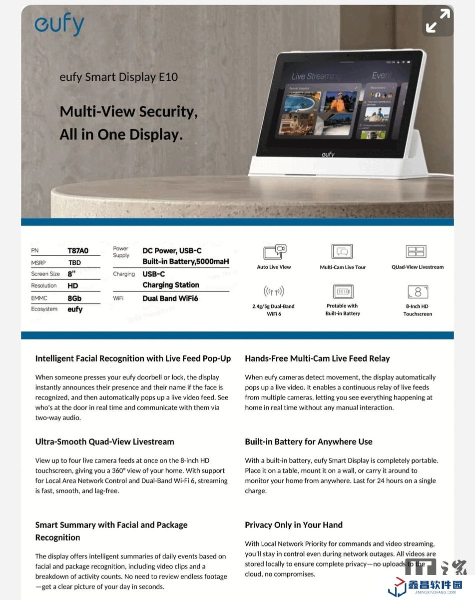 根據泄露的產品手冊顯示,Eufy E10 配備 8 英寸高清觸摸顯示屏,內置電池可提供 24 小時的續航,并支持壁掛安裝。設備搭載 8GB eMMC 存儲,支持 2.4GHz / 5GHz 雙頻 Wi-Fi 6,具備面部識別等智能功能,由于采用本地視頻存儲,即使在斷網情況下仍可正常使用核心安防功能。