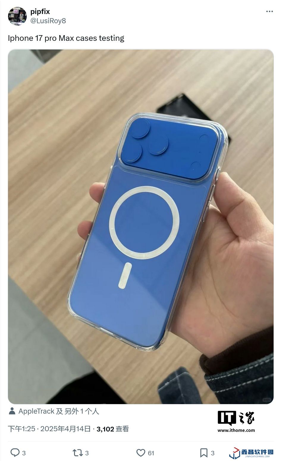 本站 4 月 15 日消息,消息源 pipfix(@lusiRoy8)昨日(4 月 14 日)在 X 平臺發布推文,分享了蘋果 iPhone 17 Pro Max 的機模 + 手機殼組合照片,展示背部配有“橫向大矩陣”,約三分之一區域搭載超大攝像頭模組。