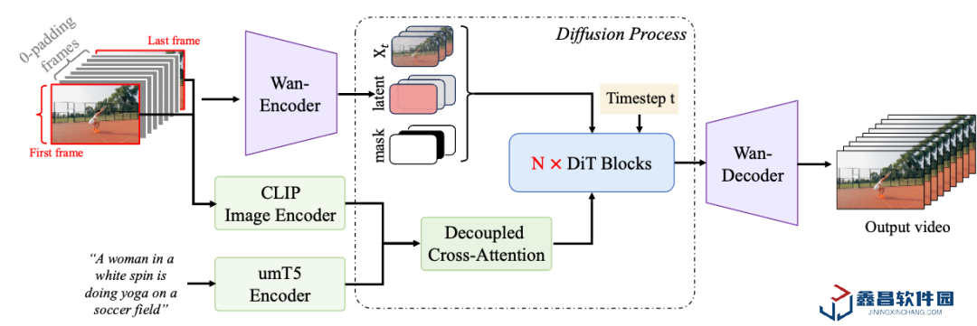 基于現有的 Wan2.1 文生視頻基礎模型架構,通義萬相首尾幀生視頻模型進一步引入了額外的條件控制機制,通過該機制可實現流暢且精準的首尾幀變換。