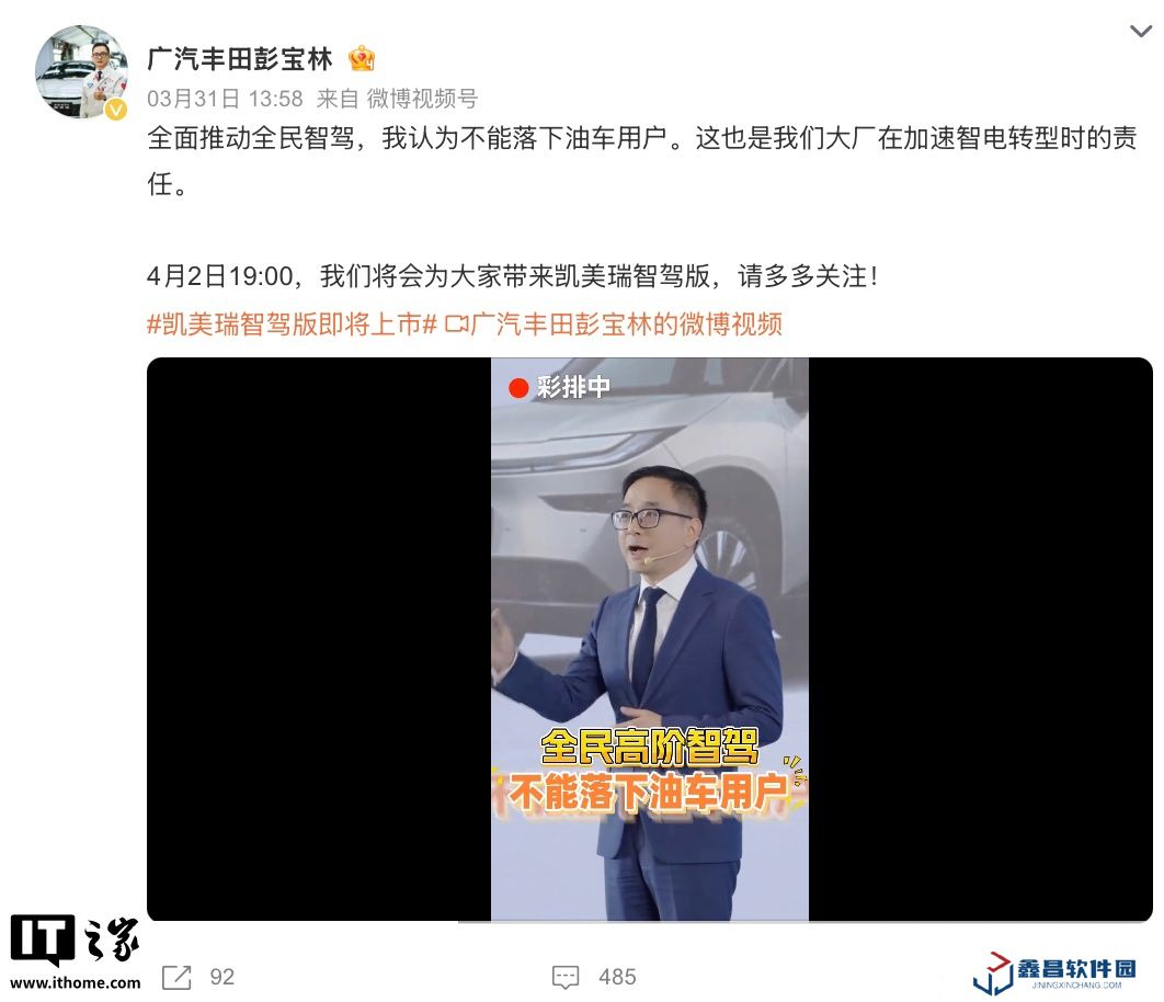 本站4 月 1 日消息,廣汽豐田凱美瑞智駕版將于明天(4月 2日)正式上市,官方今天宣布該車將搭載“高階智駕”系統,預計為 L2 級別輔助駕駛,作為比較,目前在售的廣汽豐田凱美瑞搭載 Toyota Pilot 輔助系統,指導價 17.18 萬-25.98 萬元。
