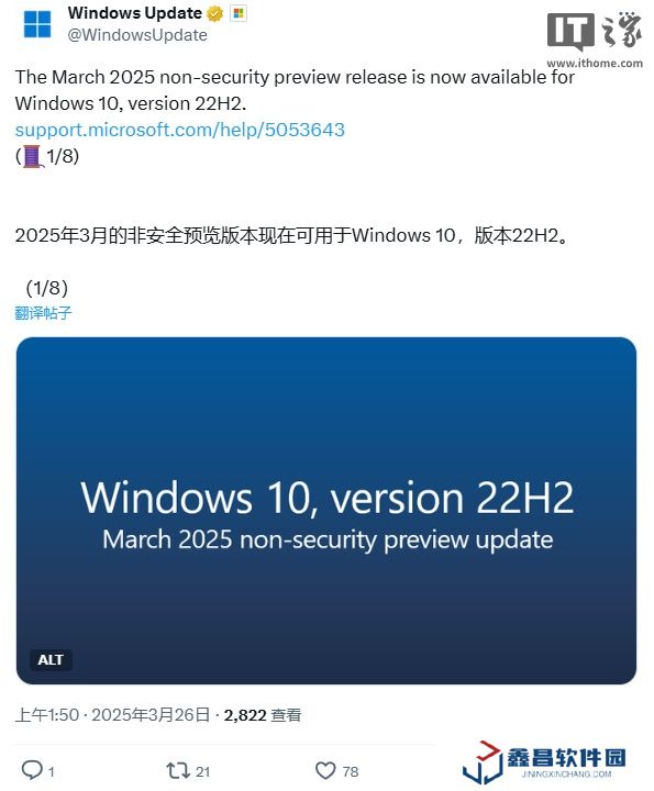本站 3 月 26 日消息,微軟今天面向 Win10 22H2 用戶放出了 KB5053643 可選更新,更新后系統內部版本號升至 19045.5679。