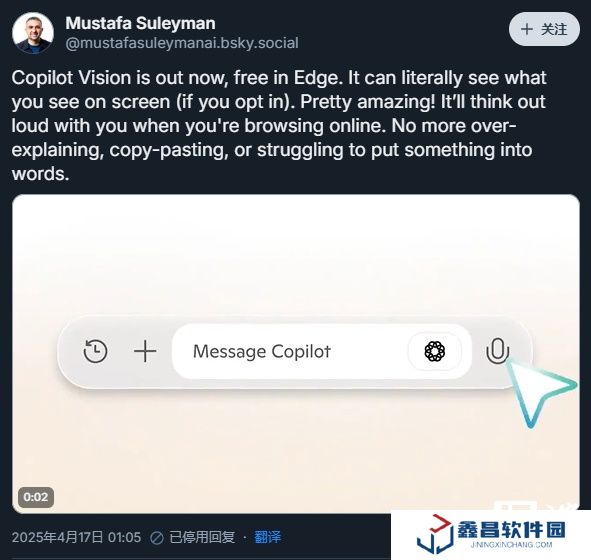 本站 4 月 17 日消息,微軟人工智能首席執行官穆斯塔法?蘇萊曼今天在 Bluesky 上宣布,微軟的人工智能助手功能“Copilot Vision”現在可以在 Edge 瀏覽器中免費使用,該功能可以解讀屏幕上的內容并幫助用戶使用應用程序。