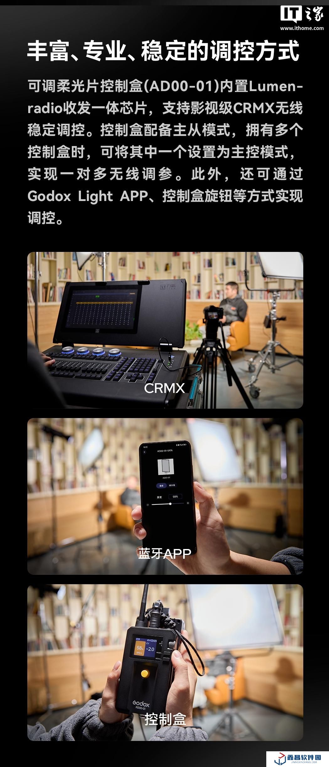 在調(diào)控方式方面,該系列可調(diào)柔光片的控制盒(AD00-01)內(nèi)置 Lumen- radio 收發(fā)一體芯片,支持影視級 CRMX 無線穩(wěn)定調(diào)控,此外還支持手機 App、控制盒旋鈕等方式調(diào)控。