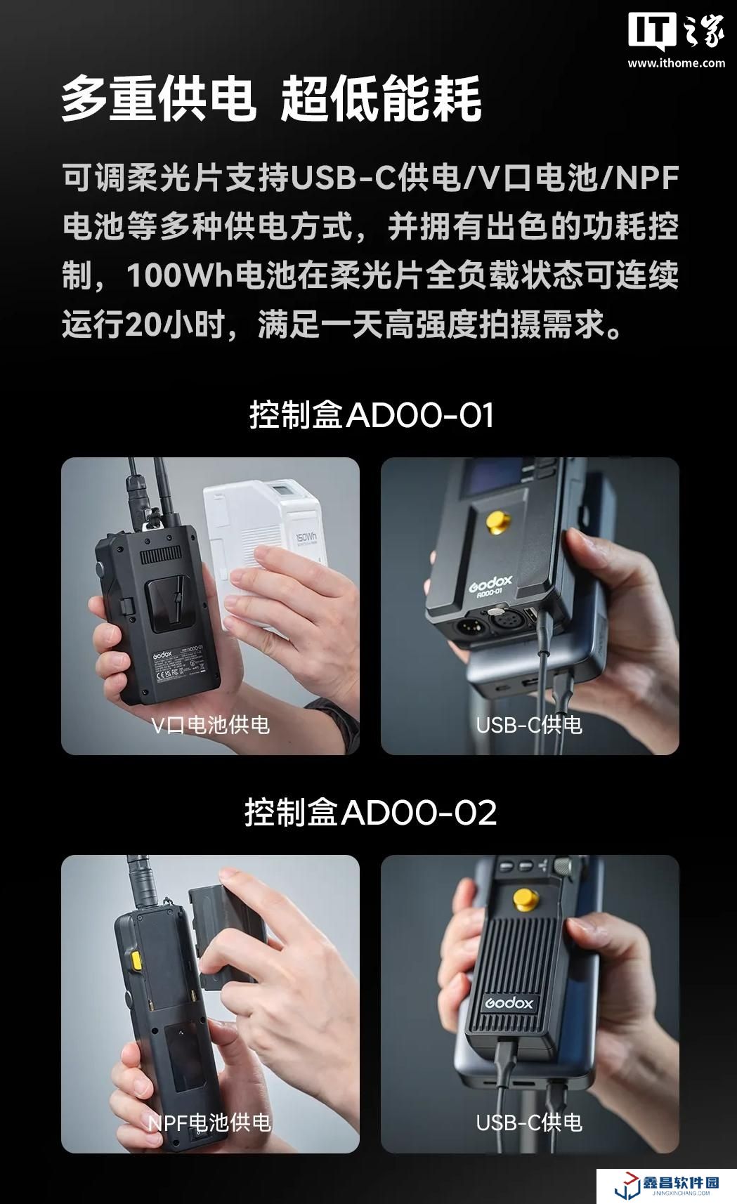 在供電方面,該系列可調(diào)柔光片擁有 USB-C 供電、V 口電池和 NPF 電池等多種供電方式,根據(jù)官方介紹,使用 100Wh 的電池在柔光片全負載狀態(tài)下可連續(xù)運行 20 小時,可滿足一天的高強度拍攝需求。