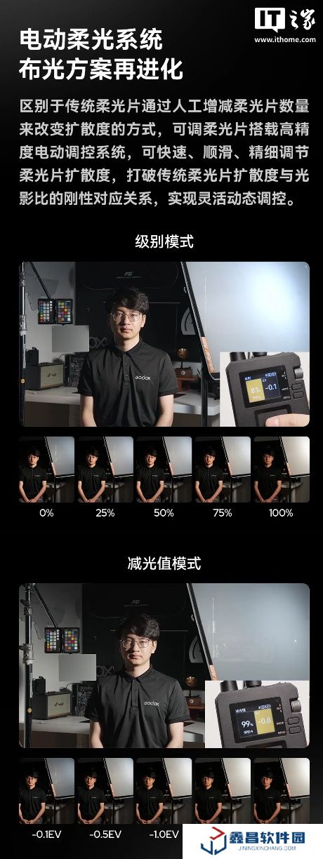 根據(jù)神牛官方介紹,該系列可調(diào)柔光片區(qū)別于傳統(tǒng)柔光片通過人工增減柔光片數(shù)量來改變光擴散度的方式,搭載電動調(diào)控系統(tǒng),可一鍵調(diào)節(jié)柔光片擴散度,擁有級別模式和減光值兩種調(diào)控模式,級別模式可在 0~100% 的百分比值之間可視化快速調(diào)節(jié),減光值模式支持-0.1~-2.0EV 的調(diào)控,更貼合專業(yè)用戶的習慣,實現(xiàn)靈活動態(tài)調(diào)控。