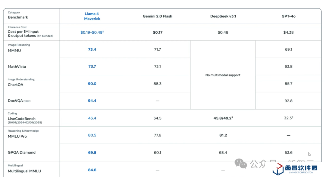 在下面這個表格中,Meta 將 Llama 4 和 Gemini2.0 Pro、GPT-4.5 等模型進行了比較,數字非常漂亮。