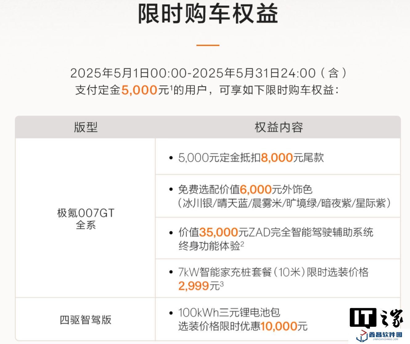 本站 5 月 5 日消息,極氪官網顯示,極氪 007 GT 純電獵裝推出了 5 月購車權益。從即日起至 5 月 31 日(含)支付定金 5000 元的用戶,可享如下限時購車權益: