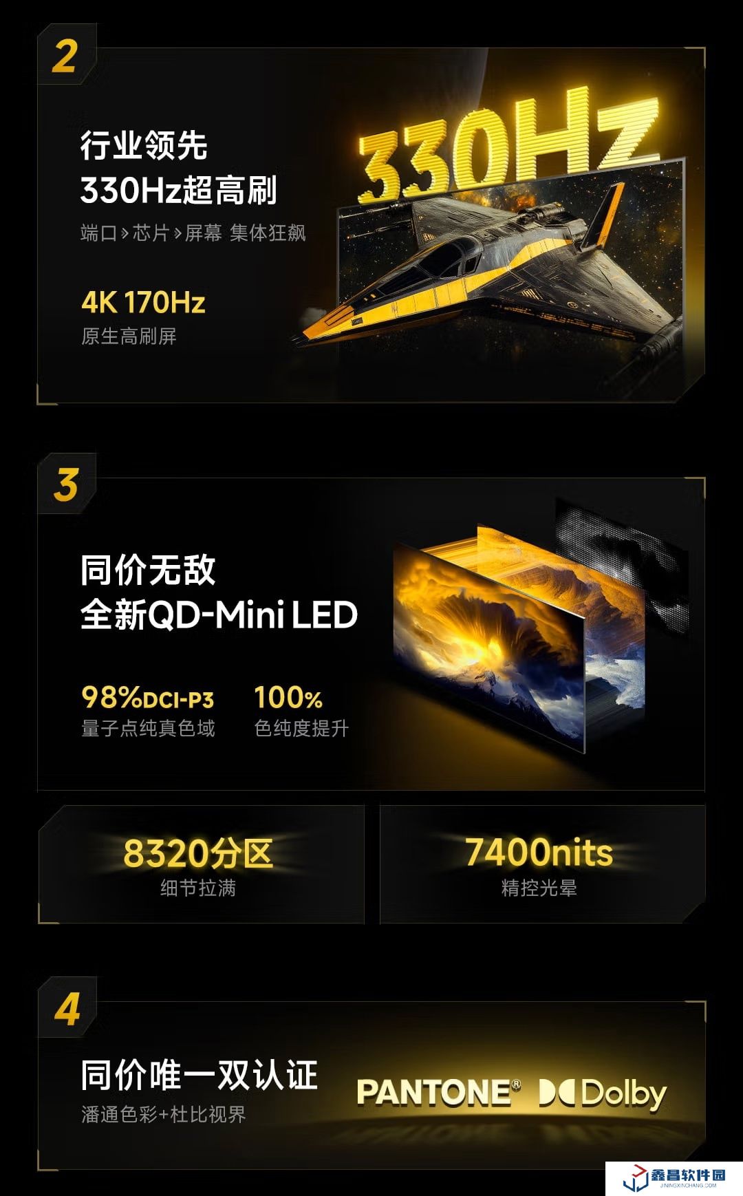 以 116 英寸型號為例,這款 QD-Mini LED 電視采用了具備 3 倍深邃、3 倍抗光、1.8% 反射率、7000:1 原生對比度的“黑曜屛”,支持 4K 170Hz 顯示,最高可達 330Hz。