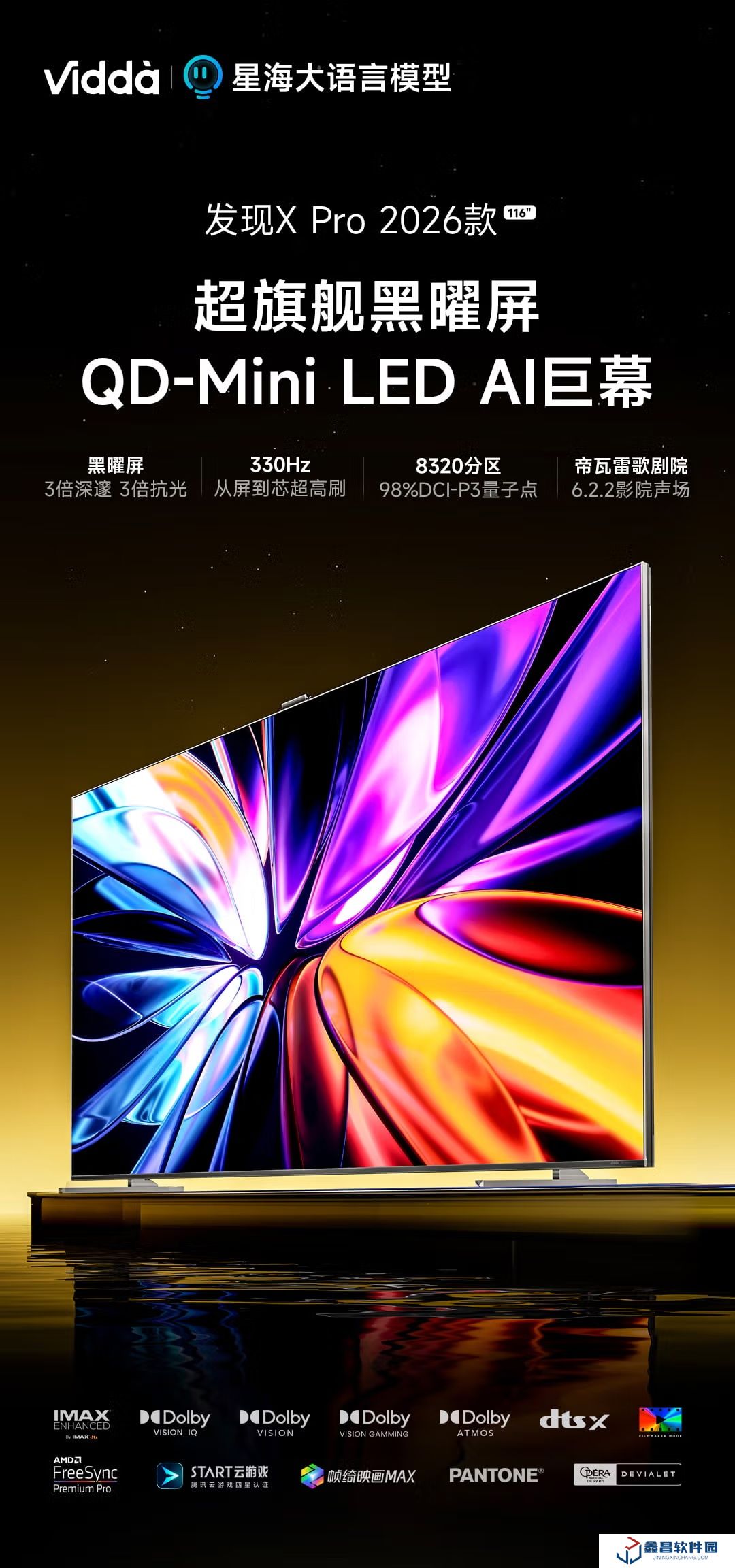 Vidda 發現 X Pro 2026 款 QD-Mini LED 電視發布:峰值亮度 7400nits,116 英寸 59999 元
