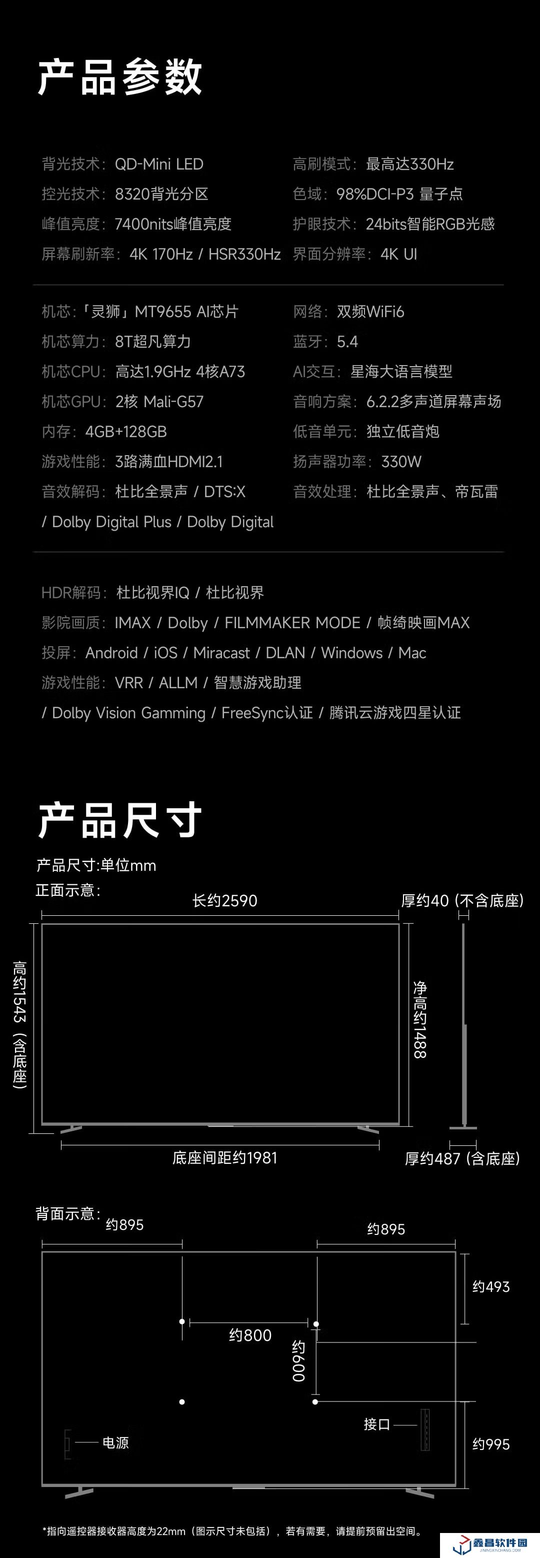 這款電視采用藍寶石八晶聚合 Mini 燈芯,最高具備 8320 個 Mini LED 分區,支持 7400nits 峰值亮度(XDR Pro)、24bits 背光調光、20000Hz 高頻調光、智慧 RGB 光感,可實現 100% 色純度提升,覆蓋 98% DCI-P3 色域,號稱 10 年不褪色;還擁有同價唯一雙認證(潘通色彩 + 杜比視界)。
