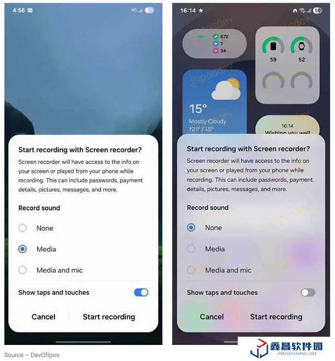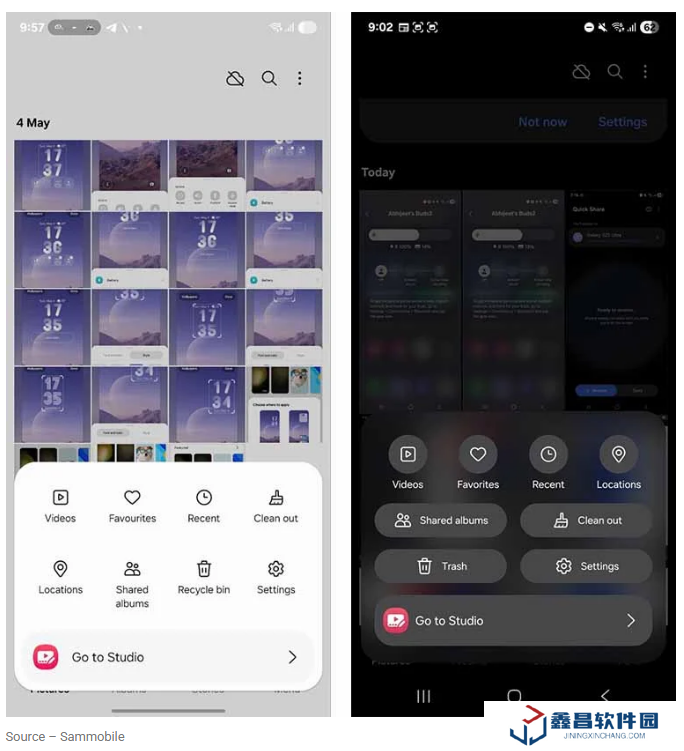例如,Gallery App 的選項(xiàng)卡從 One UI 7 的非透明設(shè)計(jì),升級(jí)為帶有模糊和磨砂效果的背景,增加陰影層以調(diào)暗背景圖像,突出前景內(nèi)容;此外,屏幕錄制功能彈出窗口也采用了半透明背景,通過提升 UI 的深度感,讓用戶更聚焦于當(dāng)前操作。