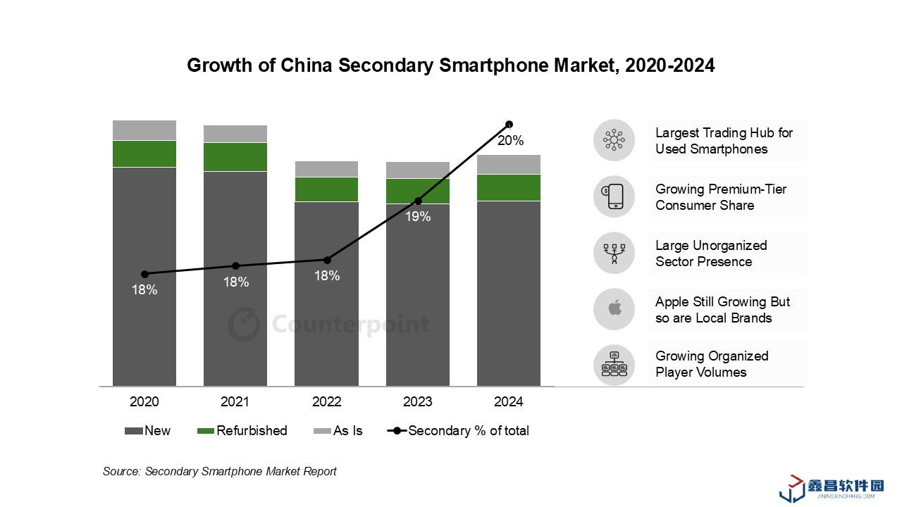 - CounterPoint:2024 中國(guó)二手智能手機(jī)市場(chǎng)占全國(guó)銷量 20%,同比增長(zhǎng) 6%