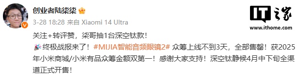 蜂巢科技合伙人@創業者陸柒柒 透露,該產品眾籌上線不到 3 天全部售罄,獲 2025 年小米商城 / 小米有品眾籌金額雙第一,深空鈦靜候 4 月中下旬全渠道正式開售。