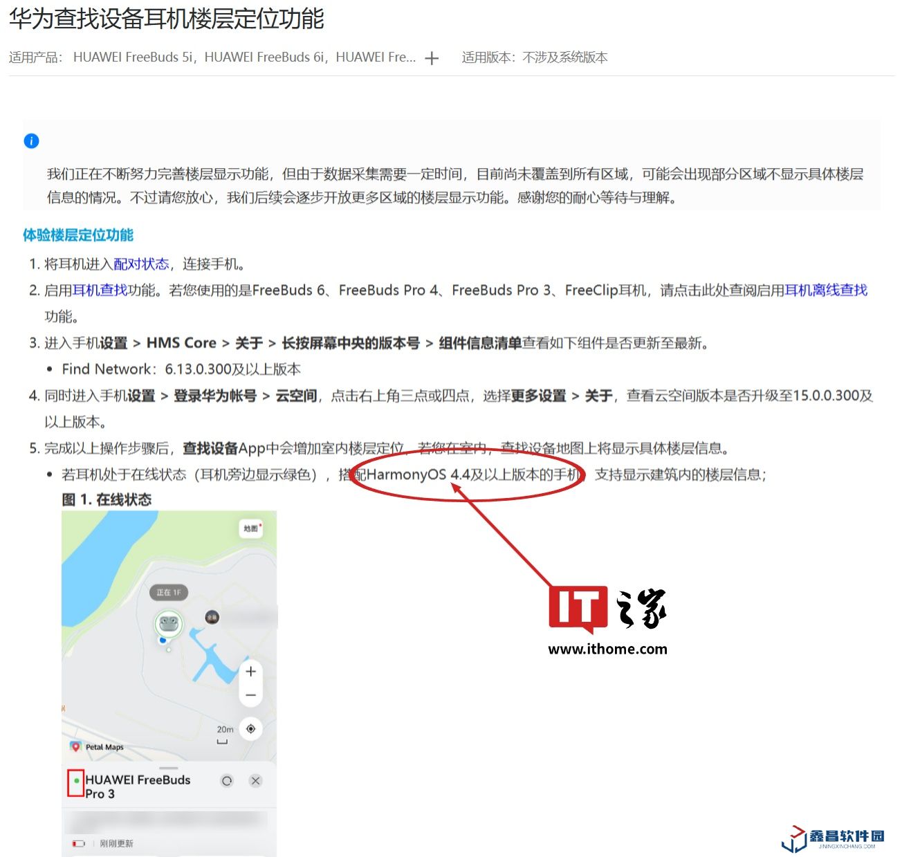 本站注意到,華為官網現對查找設備耳機樓層定位功能介紹進行更新,其中 FreeBuds 6、FreeBuds Pro 4、FreeBuds Pro 3、FreeClip 耳機支持室內樓層定位,搭配 HarmonyOS 4.4 及以上版本的手機,支持顯示建筑內的樓層信息。