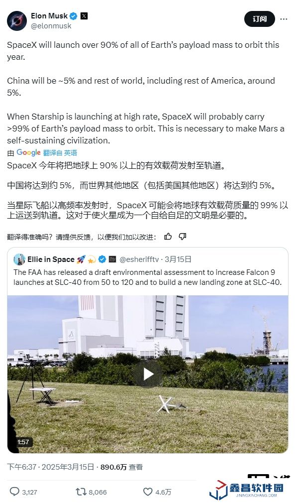 馬斯克:今年超 90% 的地球軌道有效載荷發(fā)射任務(wù)將由 SpaceX 承擔(dān)
