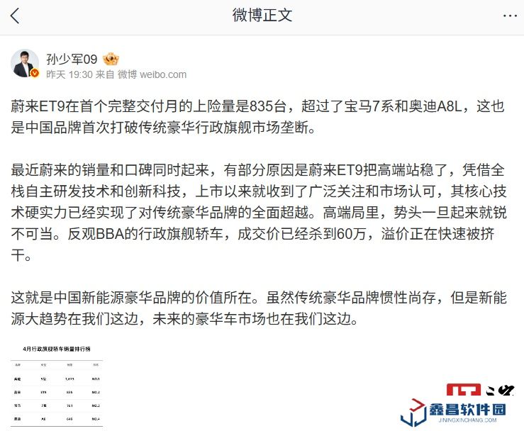 本站 5 月 13 日消息,博主@孫少軍09 昨日發文稱,蔚來 ET9 汽車在首個完整交付月的上險量是 835 臺,超過了寶馬 7 系和奧迪 A8L,這也是中國品牌首次打破傳統豪華行政旗艦市場壟斷。