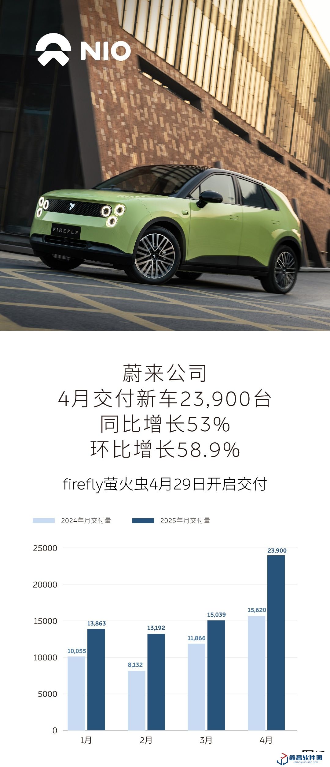 據此前報道,2025 年 4 月,蔚來公司交付新車 23,900 臺,同比增長 53%,環比增長 58.9%。其中,蔚來品牌交付新車 19,269 臺;樂道品牌交付新車 4,400 臺。截至目前,蔚來公司已累計交付新車 737,558 臺。其中,蔚來品牌累計交付新車 697,385 臺;樂道品牌累計交付新車 39,942 臺。
