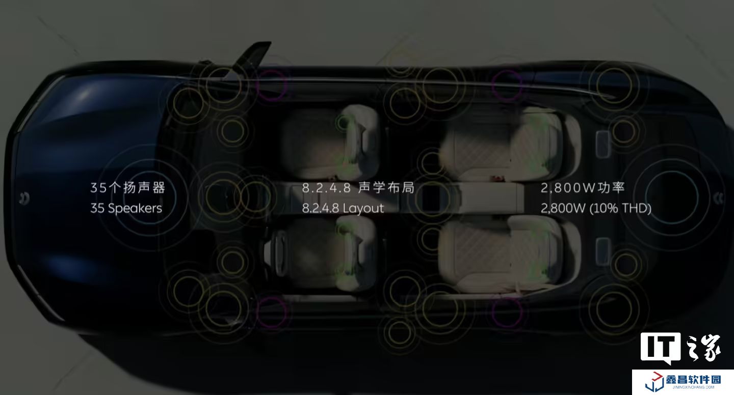 該車內置 35 個揚聲器,最高功率 2800W,首發“九霄天琴”8.2.4.8 音響系統(8 環繞聲、2 低音炮、4 個天空聲道、8 個頭枕揚聲器數量,即每個座椅兩個)。蔚來 ET9 的音箱均采用了“連錢紋”圖案,寓意“吉祥如意、福澤綿延”。