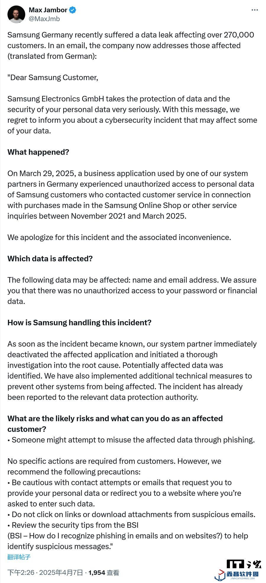 本站 4 月 9 日消息,科技媒體 SamMyFans 昨日(4 月 8 日)發布博文,報道稱三星于 3 月 29 日出現數據泄露事件,暴露了 27 萬客戶的個人數據,目前已通過郵件方式,通知受影響的德國用戶。