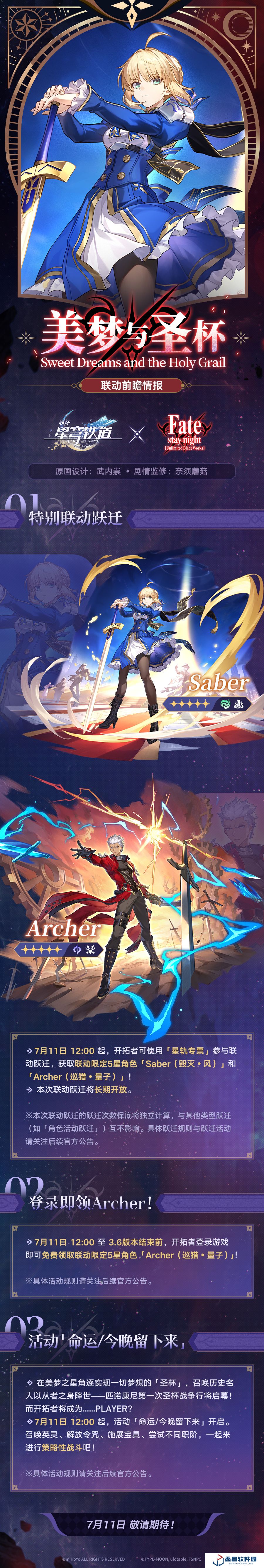 - 米哈游《崩壞:星穹鐵道》聯(lián)動 Fate UBW:7 月 11 日上線,提供 Saber、Archer 五星角色