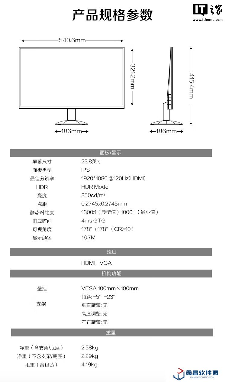 該顯示器支架支持傾斜,支持 VESA 100x100mm壁掛,提供HDMI和 VGA接口。