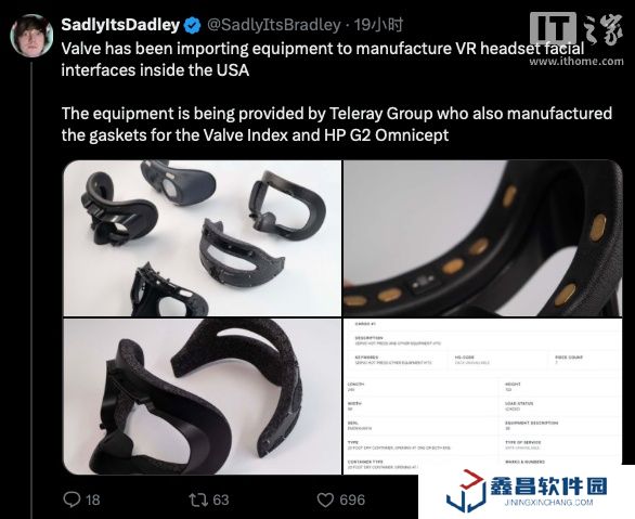該消息人士發文稱,Valve 正在進口設備,以在美國境內制造該 VR 頭顯的面部貼合部件,同時,Valve 從供應商 Teleray(曾生產過 Velve Index、惠普 G2 Omnicept 的面部密封墊)收到了 VR 頭顯面部密封墊,疑似為量產驗證或材料迭代做準備。