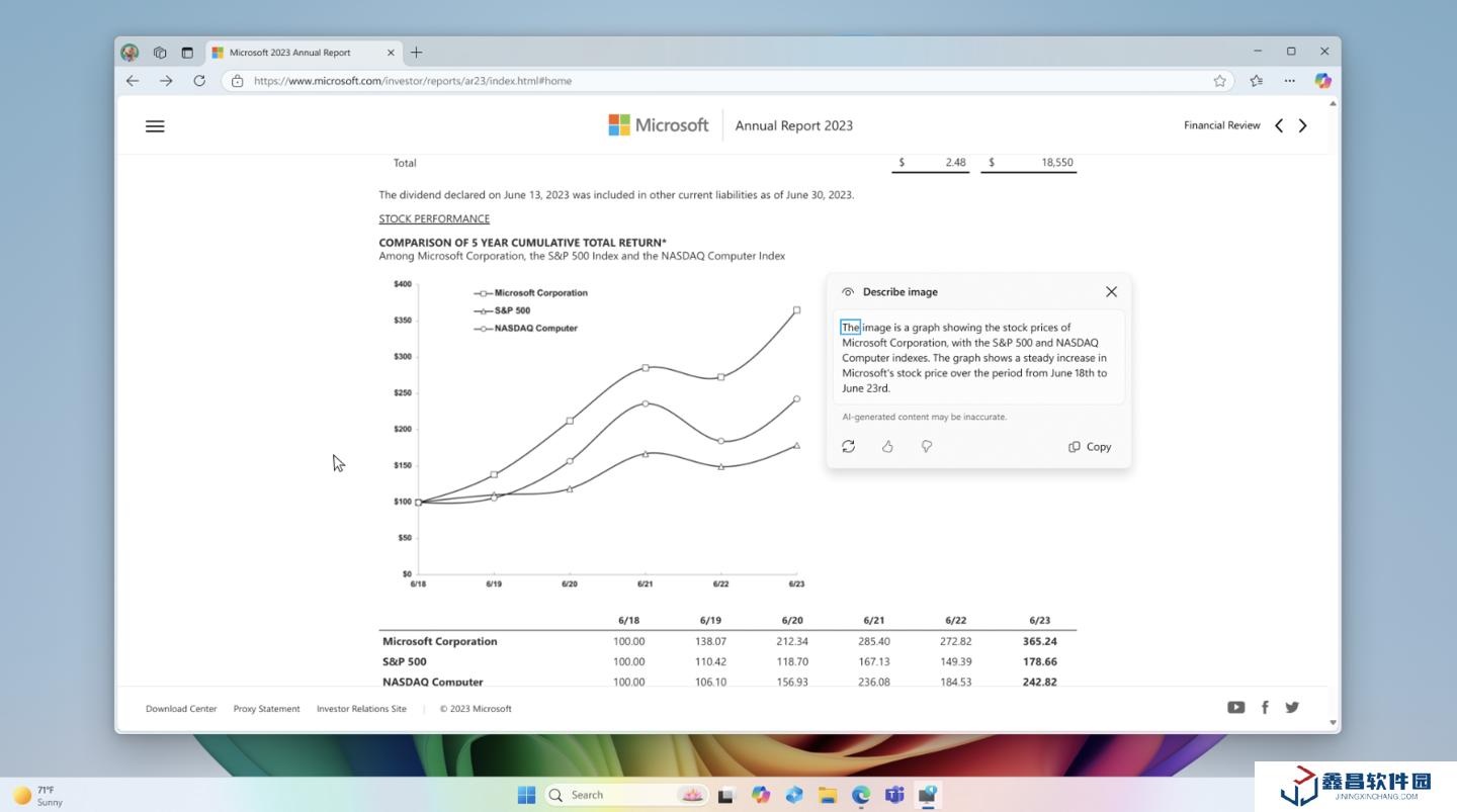 微軟強化了圖像描述功能(Narrator),現在 Copilot+ PC支持讀出各種圖片的描述,幫助障礙人群了解圖片中到底有什么東西。例如對于一張展示股票表現的圖表,用戶將得到如下詳細描述“圖表展示了微軟公司的股票價格,同時包含S&P 500及NASDAQ電腦指數,該圖表顯示從6月18日至6月23日間微軟股票價格的穩步上升”。