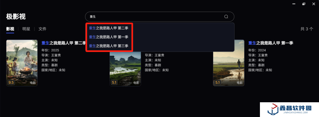 極影視搜索增加提示詞功能,優化搜索詞索引,搜索結果分影視劇、演員、文件進行篩選