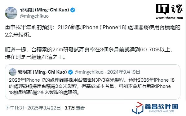 - 郭明錤重申:蘋果 iPhone 18 系列的 A20 處理器將采用 2 納米工藝