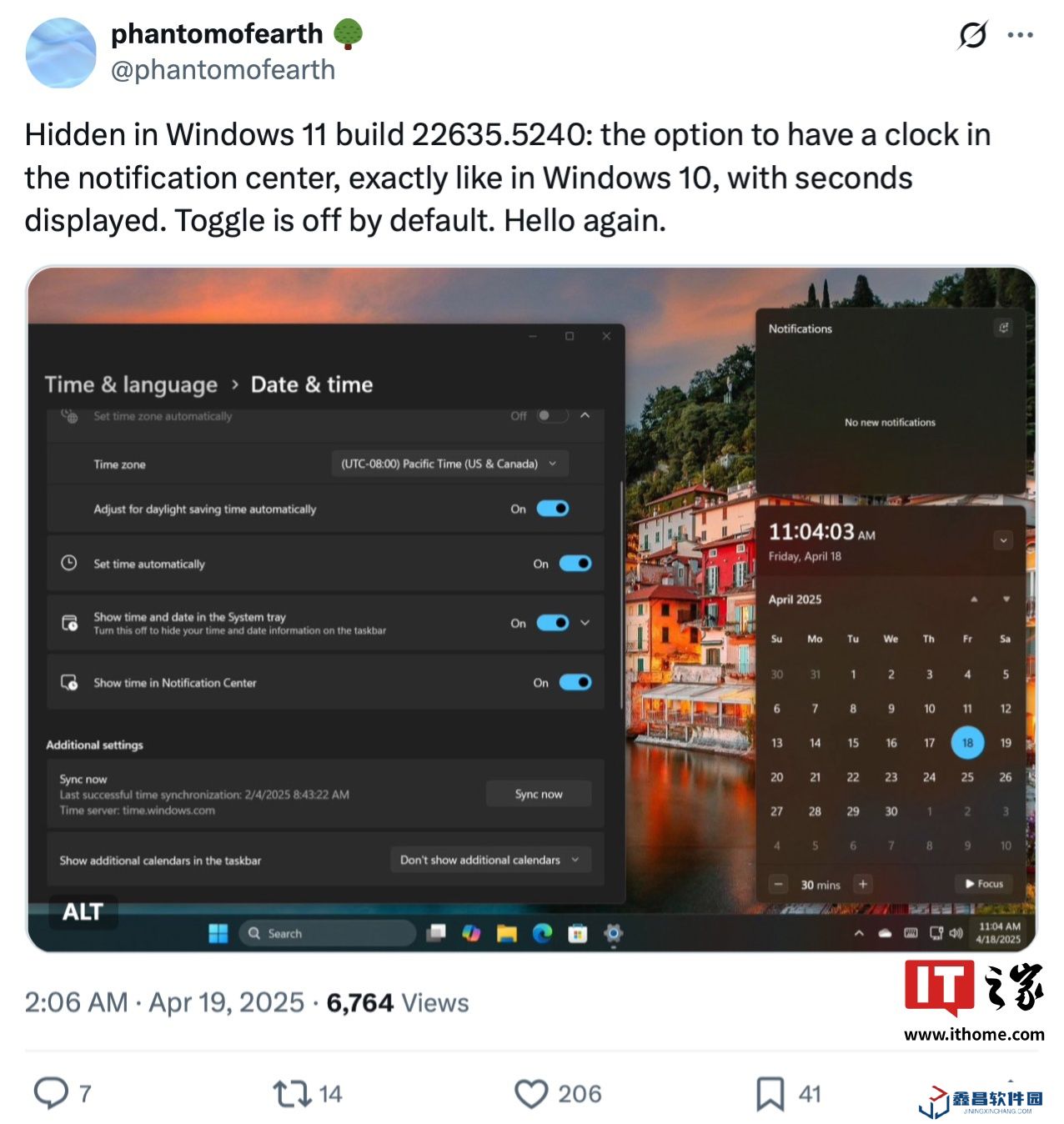 微軟悄悄為 Win11 帶回 Win10 被砍的任務欄日歷“彈出窗口”時鐘顯示功能