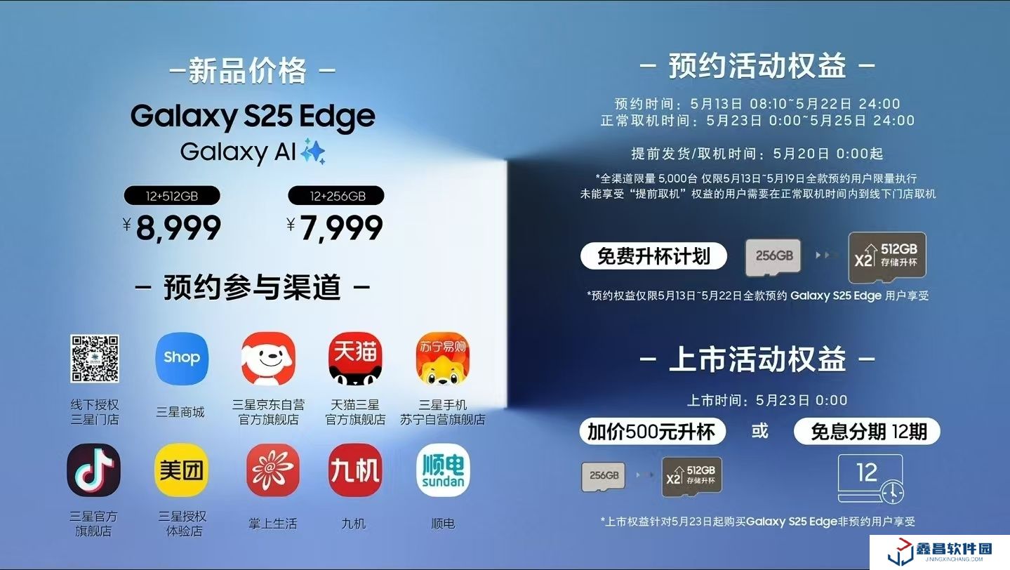 本站 5 月 13 日消息,在今天(5 月 13 日)早上 8 點開始,正在舉辦的活動中,三星推出最薄旗艦 Galaxy S25 Edge 手機,256GB + 12GB 存儲組合版本售價 7999 元,512GB+12GB 存儲組合版本售價 8999元,目前享受免費升杯計劃,消費者能以 256GB價格(7999元)購買 512GB版本。