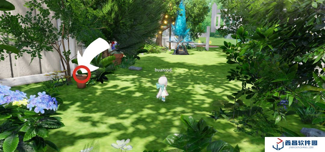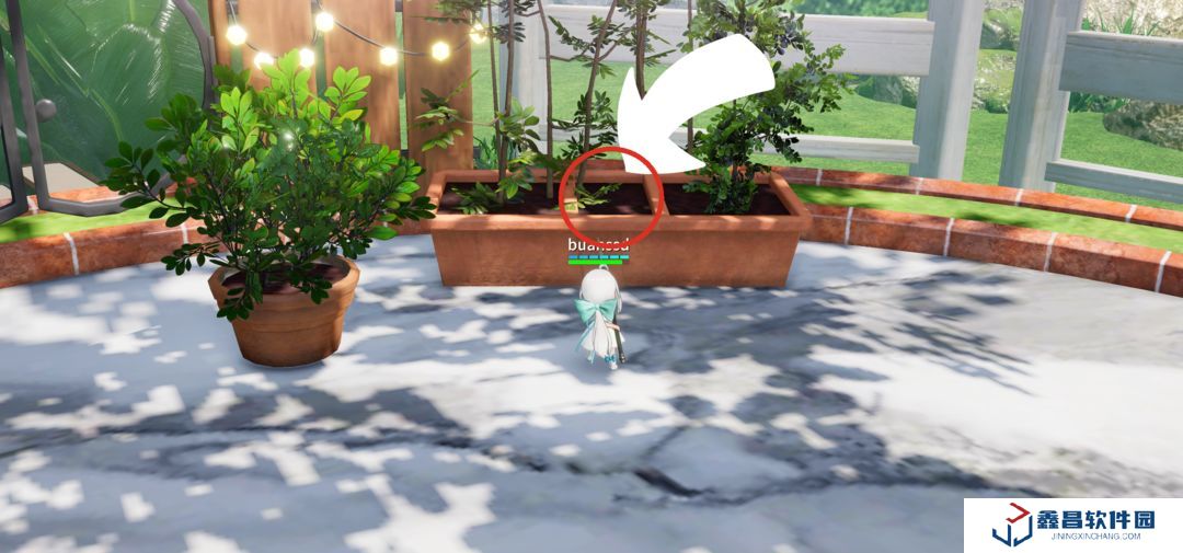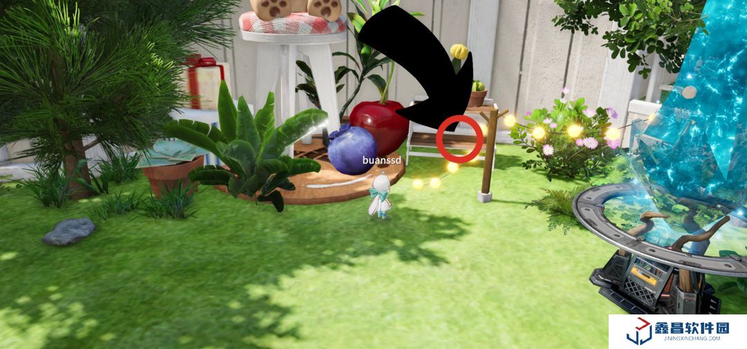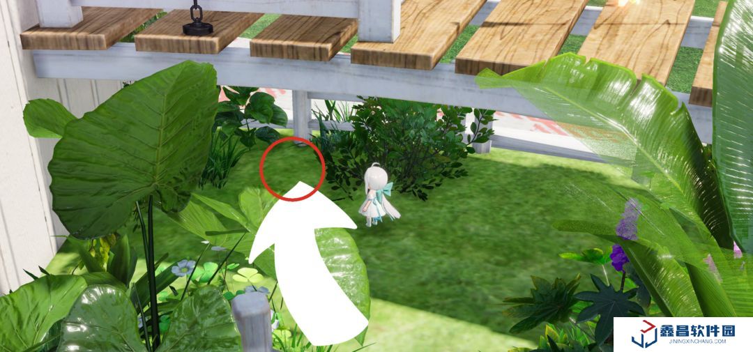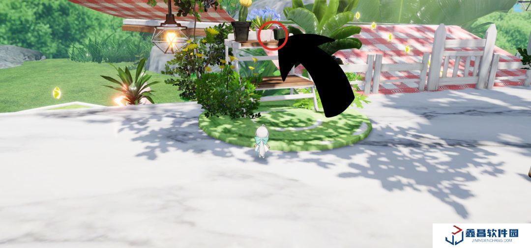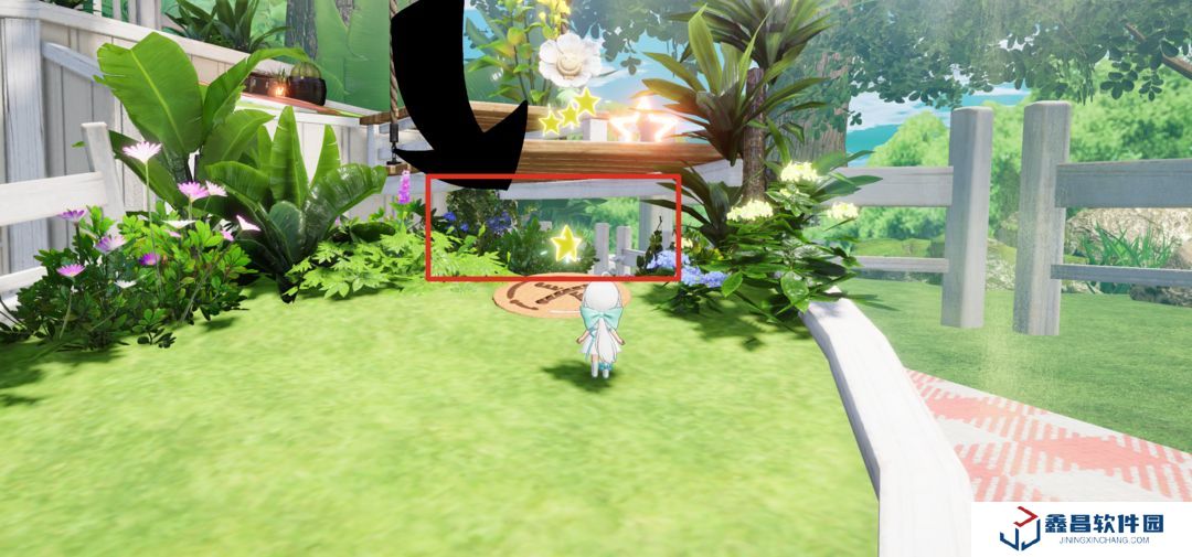 進入地圖后,激活區域裝置,走出白色柵欄門后向右走。走到到一個大花架底下后,先跳上第一層,再跳上第一層的小架子上,再從小架子跳上牌子下掛著的燈上,再從燈跳到花架的頂層就能看到了