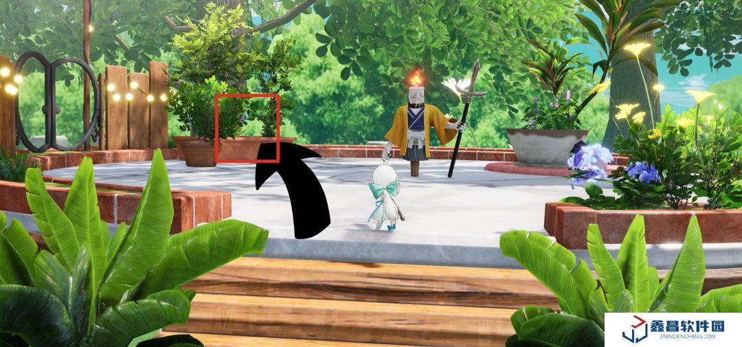 進入地圖后,激活區域裝置,走出白色柵欄門后跟著星星走,一直到有著灰物的平臺上,將灰物擊敗后走到距離探索員最近的架子前,跳上擺著三株植物的頂層就能看到了